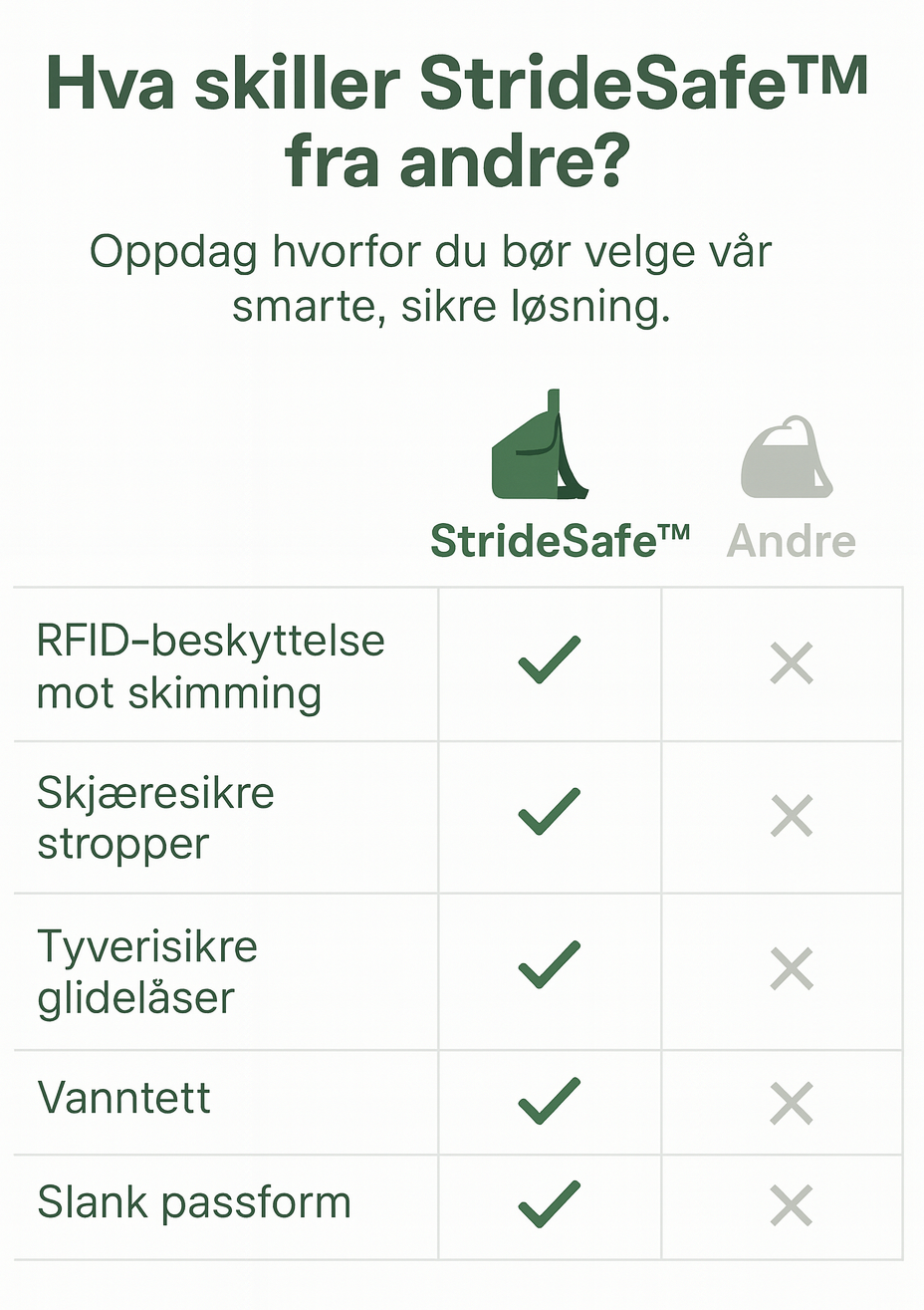 StrideSafe – sikker med kuttbestandig materiale. Vesken er laget av kuttbestandig stoff og forsterkede, kuttbestandige stropper. Skjulte glidelåser og et diskret design beskytter verdisakene dine mens du er på farten.